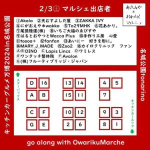 2/3(土) ①Akala ②天むすよしだ屋 ③ZAKKA IVY ④にがおえや*wakka ⑤Ta29MHK ⑥花あかり。 ⑦尾張陸運(株) ⑧いちご大福のゑびすや ⑨はるとおやつとWacca Plus ⑩手作り工房 心愛 ⑪toooa+ ⑫fanfan ⑬あいにー 好きを形に。 ⑭MARY_J_MADE ⑮Zoo2 ⑯カイロクリニック ファン AB)DINO C)Lapis Lincs D)ワミレス E)ワンタッチ整体院 F)Avalon G)(株)フルーティブリッジ・ジャパン